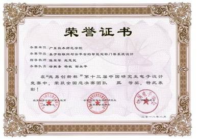 8月21日,“兆易创新杯”第十三届中国研究生电子设计竞赛总决赛结果公布。公司员工徐献胜、杨敏、谢永平组成的团队(指导老师陈荣军、赵慧民)荣获全国总结赛团队三等奖。