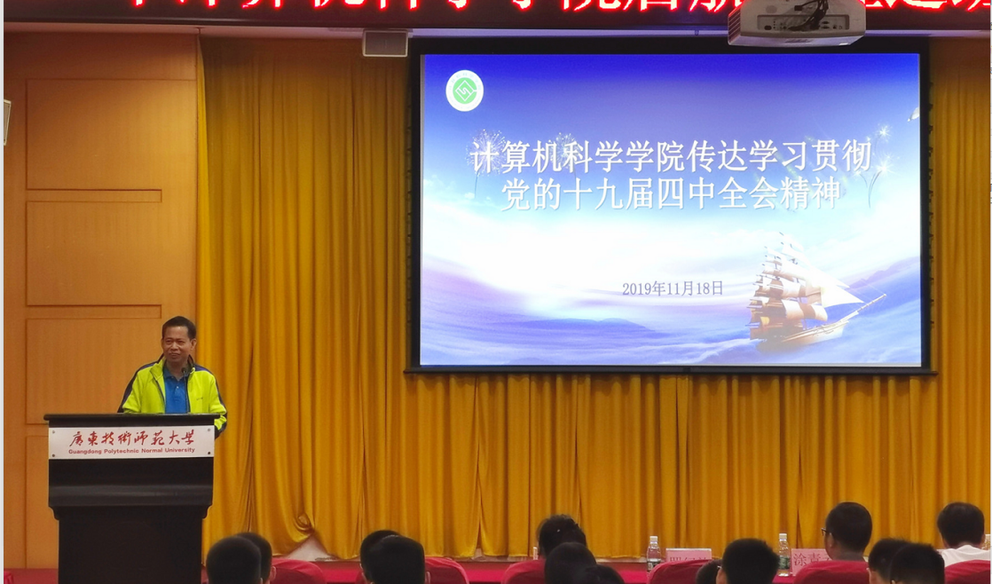 11月18日,在第一教学楼208会议室,罗纪旋书记向全体员工干部传达学习贯彻党的十九届四中全会精神。党的十九届四中全会是在新中国成立70周年之际、“两个一百年”奋斗目标的历史交汇点上,召开的一次具有开创性、里程碑意义的重要会议。全会审议通过的《决定》,对坚持和完善中国特色社会主义制度、推进国家治理体系和治理能力现代化作出了全面部署,是指导全党、全国人民推进新时代中国特色社会主义伟大事业的纲领性文件。