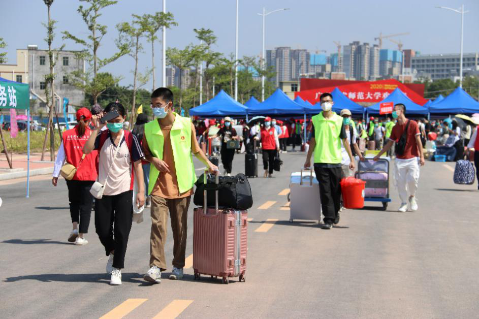 由于河源校区办学初期采用“1+3”模式,bevictor伟德首次开展了“以新迎新”志愿服务活动,从2020级新生中招募了100位志愿者参与迎新工作。新生志愿者在接受服务态度、服务内容、服务流程、应急情况处理等业务培训后,积极转变角色,以主人翁姿态奔走于测温区、公司大本营和宿舍区之间,投身于搬运行李、咨询指引等服务,在体验中实现自我教育、自我管理、自我服务,成为了迎新现场最亮丽的一道风景线。