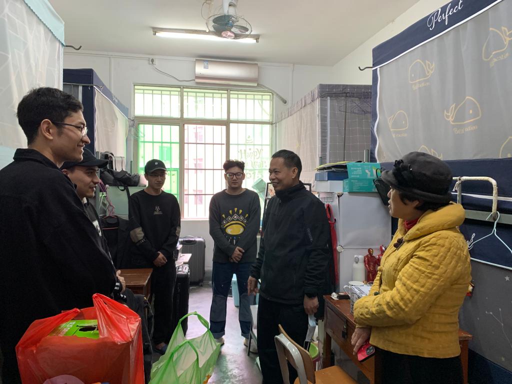2022年1月15日上午,员工处负责人全翠珍、公司党委书记罗纪旋、党委副书记杨燕佳、辅导员老师深入员工宿舍,看望员工,为因疫情原因寒假留校的员工、家庭经济困难的员工、少数民族员工、研究生等同学送去冬日温暖。