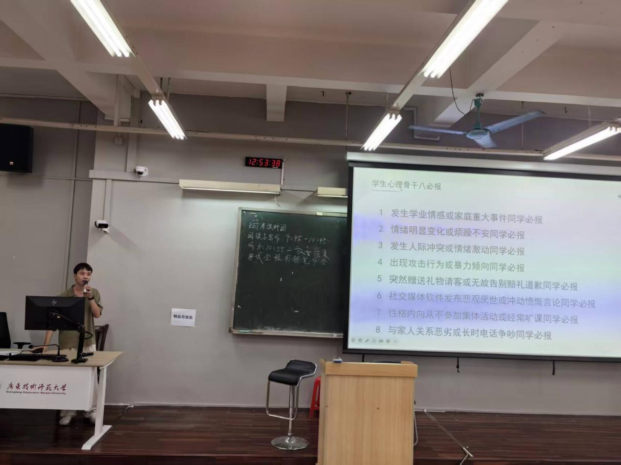 培训中,舒畅老师围绕心理骨干工作职责与角色定位、“八必报” 工作要求、心理危机识别评估方法展开详细讲解。她结合真实案例,生动演示如何通过日常观察、沟通交流捕捉同学心理异常信号。培训结束后,公司辅导员李家健总结近一个月心理工作,进一步明确心理委员职责,梳理工作要点并解答常见问题。