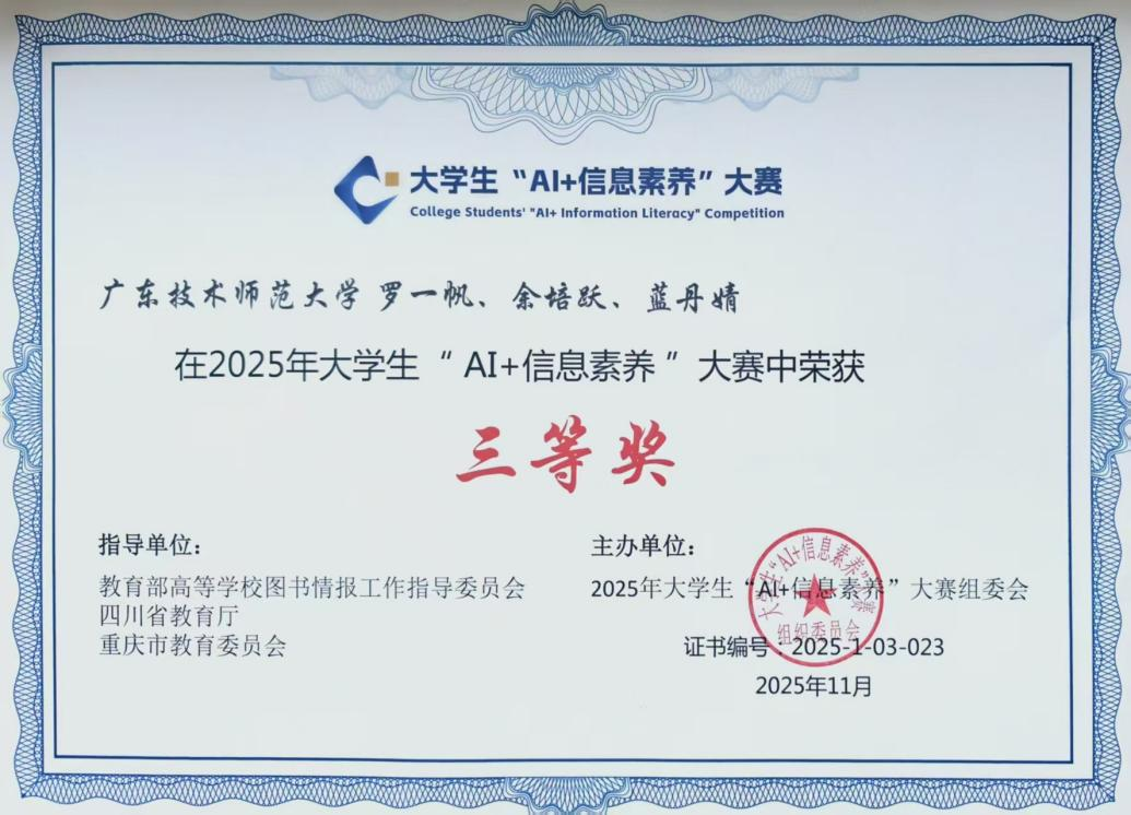 2025年11月27日,全国老员工“AI+信息素养”大赛全国联赛本科生赛道颁奖典礼在成都圆满收官,公司2025级新生罗一帆同学领衔的参赛团队荣获全国联赛本科生赛道三等奖,充分展现了公司学子扎实的专业素养与锐意进取的精神风貌。