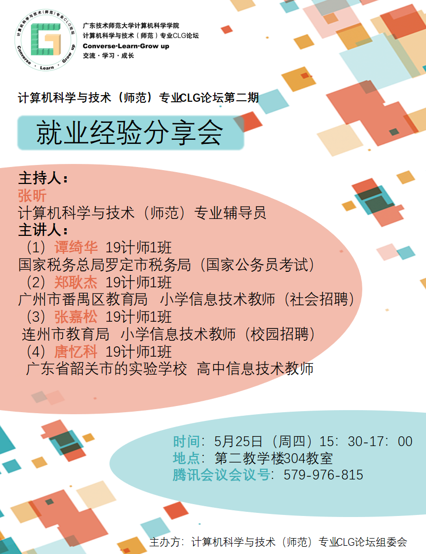 为激发员工考研热情,营造良好考研氛围,助力考研学子做好学业规划,增强考研信心,计算机科学与技术(师范)专业于5月25日下午3点在第二教学楼302教室举行了计师专业CLG论坛第二期暨2023届毕业生就业经验分享会。
