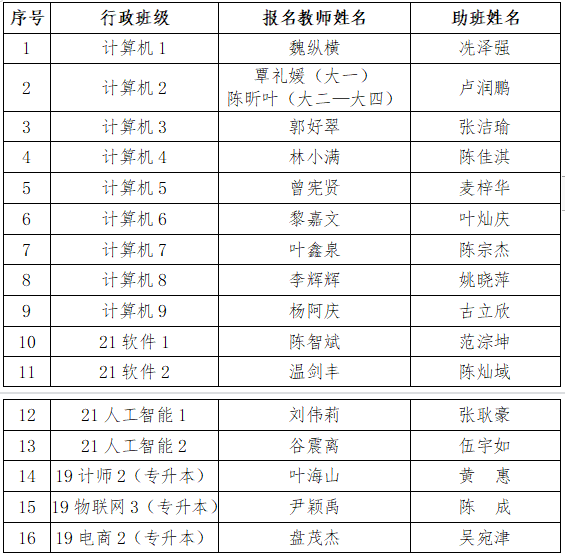 经个人报名、公司推荐、公司班主任工作领导小组研究,确定公司2021级新生班主任名单如下(见下表),公示期为2021年8月30日——2021年9月1日。如有任何问题或意见,请联系计科院学工办,联系电话020-38256732。