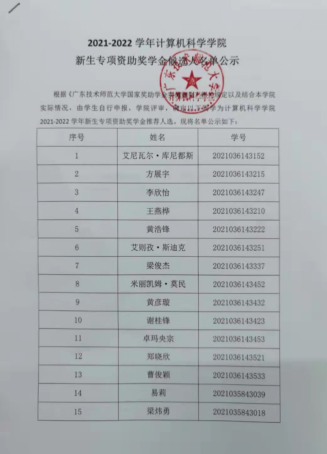 2021-2022学年bevictor伟德新生专项资助奖学金候选人名单公示