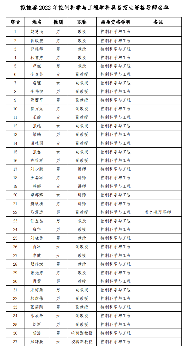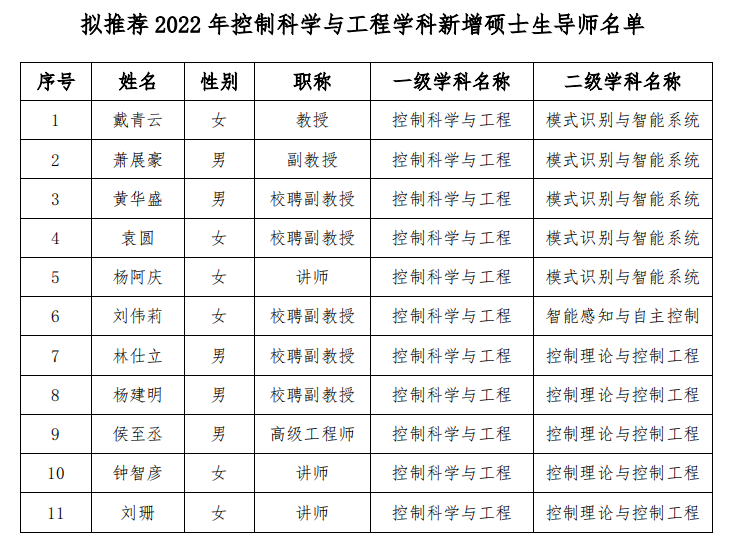 按研究生院《关于开展 2022 年研究生导师遴选及招生资格审核 工作的通知》要求,根据《伟德源自英国1946研究生导师遴选办法》(广师大〔2020〕214 号))、《2022 年控制科学与工程学科研究生导 师招生资格审核工作方案》,经个人申请,控制科学与工程硕士点学 位评定分委员会会议评审,拟推荐申请教师戴青云等 11 人为 2022 年控制科学与工程学科新增硕士生导师,拟推荐赵慧民等 37 名导师(含校外兼职导师)为公司 2022 年控制科学与工程学科具备招生资格导师,现予以公示。