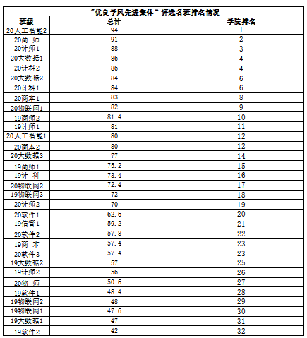 根据各班最终得分和排名情况,公司决定授予20人工智能2班为“学风建设标兵班级”、授予20计师1班和20电商师1班为“学风建设先进班级”、授予20大数据1班、20计科2班、20大数据2班、20计科1班为“学风建设优秀班级”荣誉称号。