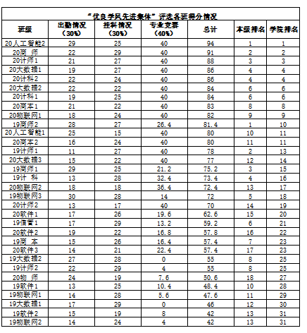 按照2021—2022学年“优良学风先进集体”评选细则,各班以出勤情况占30%、挂科情况占30%、专业竞赛占40%,比例得出各班级总得分: