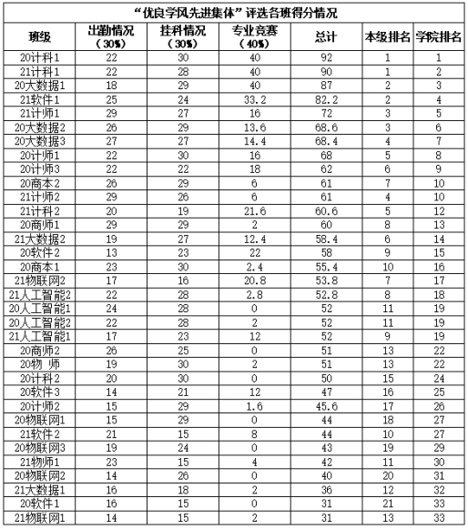 按照2022—2023学年“优良学风先进集体”评选细则,各班以出勤情况占30%、挂科情况占30%、专业竞赛占40%,比例得出各班级总得分: