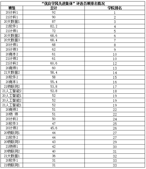 根据各班最终得分和排名情况,公司决定授予20计科1班为“学风建设标兵班级”、授予21计科1班和20大数据1班为“学风建设先进班级”、授予21软件1班、21计师1班、20大数据2班为“学风建设优秀班级”荣誉称号。