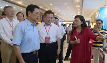图:公司郭杰经理、戴青云副经理和赵慧民教授向省政府党组成员陈云贤副书记、景李虎厅长介绍项目成果与产品.