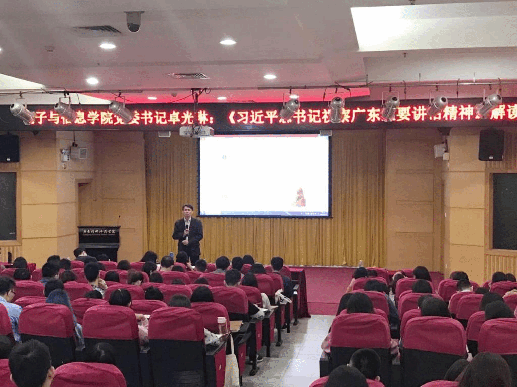 2018年11月17日,广东技术师范公司2018年下半年新生党员和发展对象第二次校级党课开课,主讲人为电子与信息公司党委书记卓光琳。在第二节党课上,卓光琳书记为大家解读了《习近平总书记视察广东重要讲话精神》。