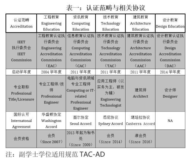 IEET( Institute of Engineering EducationTaiwan的简称),即中华工程教育学会,成立于2003年,并于2007年成功晋升国际工程教育认证协议-华盛顿协议(Washington Accord, WA)正式会员,是台湾地区三大专业评鉴机构之一,主要规划和执行符合国际标准的工程教育(ECA)、资讯教育(CAC)、技术教育(TAC)及建筑教育(AAC)的认证(见表一)。认证执行委员会委员包括学术界的资深教授、产业界十年以上的资深工程师以及行政管理者等。