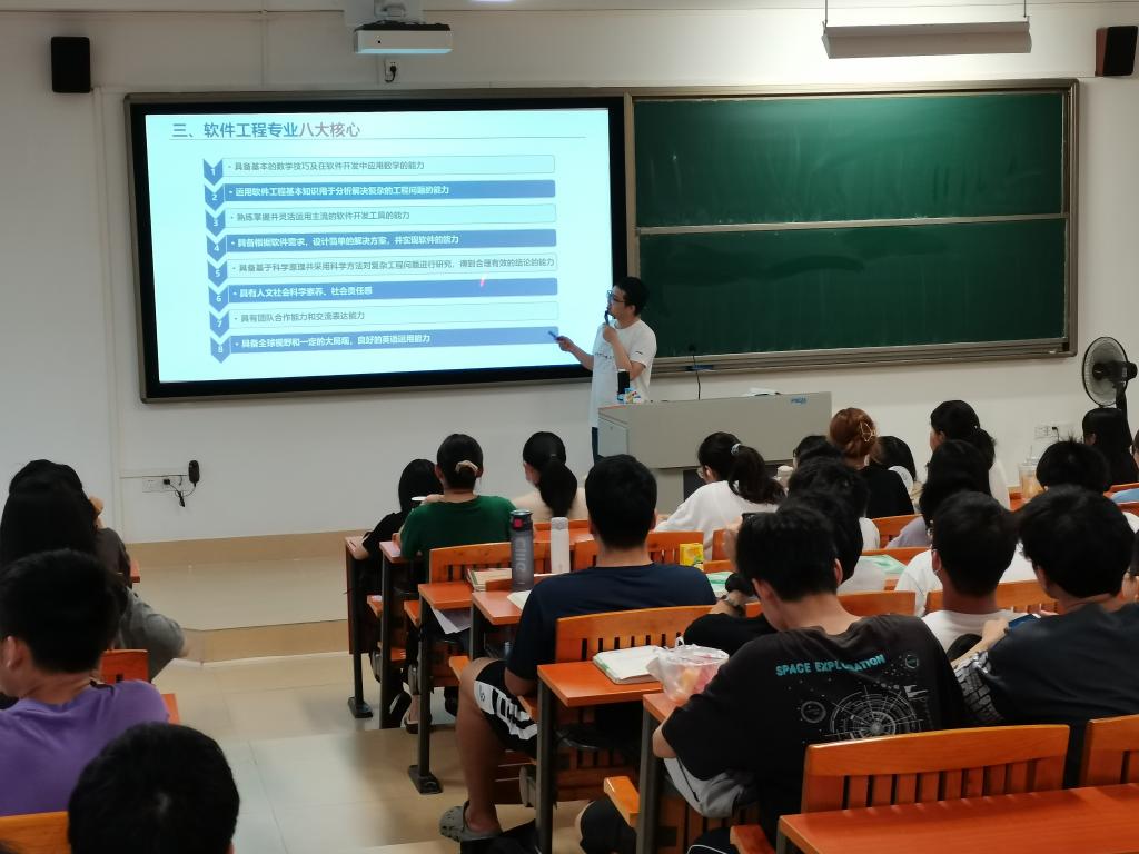 2020年的10月,对广师大的学子来说,是一个比较特殊的开始。上半年的疫情终于告一段落,学子们迎来了久违的线下课堂,且今年的新生又在新校区上课,为了让2021级软件工程专业的新生在这新的学习环境当中,仍然能够保持着一颗学习的初心,2020年10月15日,软件工程系专业负责人郝刚老师、周原老师、叶鑫泉辅导员对本届软件工程专业的新生开展了一次专业宣讲活动。