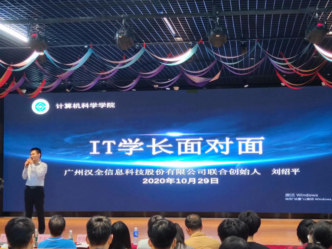 10月29日下午,东校区第二教学楼602课室座无虚席,广州汉全信息科技股份有限公司联合创始人刘绍平员工应邀为公司做就业讲座,主题为:十年后再看科技月。公司党委罗纪旋书记、李双贵副书记以及辅导员杨燕佳老师、涂青云老师、李艺晴老师、梁立基老师和计科公司员工一起聆听讲座。